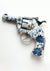 Schilderij van een revolver, verfraaid met ingewikkelde blauwe bloemenpatronen op een witte achtergrond. Dit decoratieve ontwerp geeft het vuurwapen een porseleinachtige uitstraling.