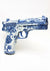 Dit schilderij toont een wapen met ingewikkelde blauwe bloempatronen die het oppervlak versieren. Het ontwerp bedekt de meeste delen van het wapen, waardoor het een sierlijk en onderscheidend uiterlijk krijgt tegen een witte achtergrond.