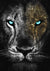 Een close-up van het gezicht van een leeuw, met een donkere, gedetailleerde vachttextuur aan de linkerkant en een goudkleurig glittereffect op de rechterkant. De opvallende helderblauwe ogen van de leeuw steken scherp af tegen de contrasterende texturen - een echt Eyes of the Tiger Schilderij van CollageDepot voor elke ruimte.