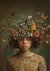 Dit schilderij toont een meisje met gesloten ogen, een bloemenhoofdtooi met kleurrijke bloemen en vlinders en een topje met bloemmotieven tegen een aardse achtergrond.