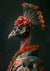 Op dit schilderij staat een kalkoen in prachtige kledij met bloemenmotieven en een hoofddeksel gedecoreerd met bloemen en pauwenveren. Het verfijnde zijprofiel van de vogel wordt tegen een donkere achtergrond weergegeven, met levendige en gedetailleerde accenten.
