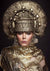 Een persoon die een uitgebreide gouden hoofdtooi en bijpassende outfit draagt, beide met ingewikkelde ontwerpen en texturen. De hoofdtooi is groot met een cirkelvormige waaierachtige structuur en decoratieve elementen.