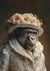 Dit schilderij toont een digitale afbeelding van een chimpansee gekleed in een sierlijke kanten jurk, compleet met een bloemenhoed met crèmekleurige rozen. De donkere, ingetogen achtergrond benadrukt de elegantie van de kleding en de uitdrukking van de chimpansee.