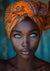 Op dit schilderij zie je een close-up van een persoon met helderblauwe ogen, gehuld in een hoofddoek met een levendig oranje en veelkleurig patroon. Met een donkere huidskleur en een neutrale uitdrukking, komt het portret tot leven tegen een wazige achtergrond in tinten groenblauw en blauw.