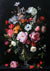 Dit schilderij toont een gedetailleerd bloemstuk in een helderglazen vaas. Met roze pioenrozen, rode rozen, witte anemonen, gele bloemen en diverse groene bladeren en stengels op een donkere achtergrond.