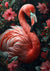 Dit schilderij toont een levendige roze flamingo, omringd door weelderig groen en roze bloemen. Het draait zijn kop opzij, waarbij zijn gebogen snavel en gedetailleerde veren goed zichtbaar zijn, wat een verbluffend beeld creëert.