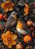 In dit schilderij zie je twee vogels met oranje en grijs verenkleed, zittend op een tak tussen levendige oranje bloemen en bessen. Om hen heen zijn donkergroene bladeren die een mooi contrast vormen met de heldere kleuren van de bloemen en vruchten.