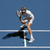 Dit schilderij toont een tennisspeler in actie, bevroren in het moment, tegen een strakke blauwe achtergrond. Kracht en concentratie verenigd.
