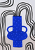 Een blauwe kruik met een gestippelde textuur en twee handvatten, voor een witte achtergrond met abstracte zwarte lijnen die lijken op haar of rook die naar boven stroomt, ideaal voor interieurposterontwerp.
