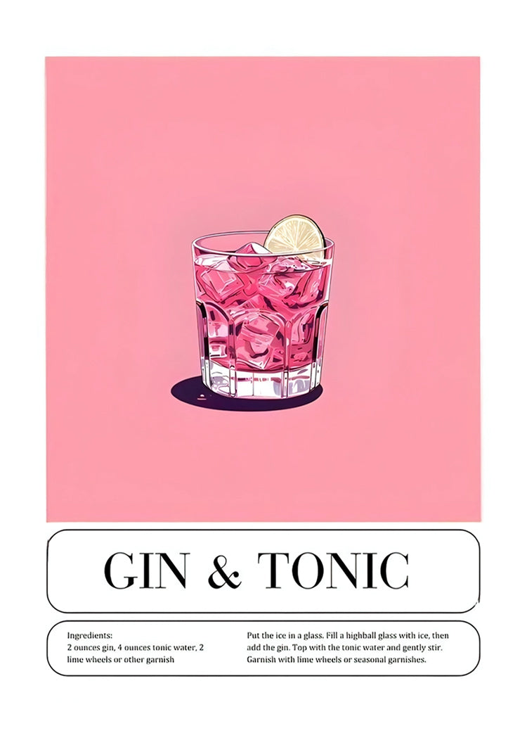 Dit schilderij toont een mooie illustratie van een gin-tonic met ijs en een schijfje limoen, op een roze achtergrond. Onder de afbeelding staat een recept met ingrediënten en bereidingsstappen.