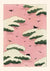 Een kunstposter in traditionele Japanse stijl met een roze lucht met zachtgroene wolken en meerdere zwarte vogels die ertussen vliegen.
