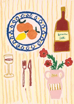 Dit schilderij toont een speelse eetopstelling: een bord sinaasappels en een citroen, een fles met het opschrift 'Bordeaux', een glas wijn, bestek en een vaas met rode bloemen, allemaal tegen een gestreepte gele achtergrond.