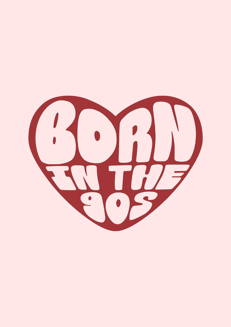 Dit schilderij vangt de levendige nostalgie van de jaren 90 met een cool roze hart en de tekst "Born in the 90s". Het is een speelse, maar toch krachtige toevoeging aan elke ruimte.
