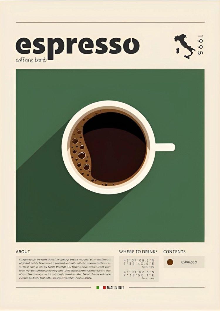 Dit heldere schilderij toont een smakelijk bakje espresso, klaar om van te genieten. Een perfecte aanvulling voor liefhebbers van koffiekunst en verfijnde smaken.