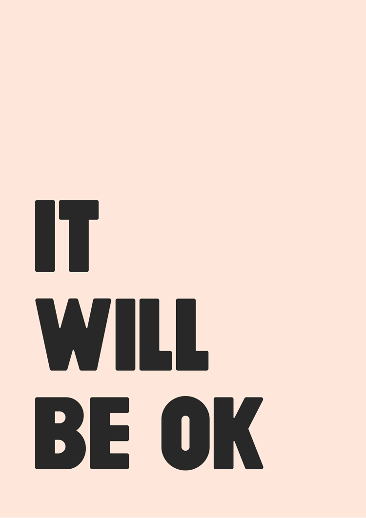 Dit tijdloze schilderij met de krachtige woorden "IT WILL BE OK" in vetgedrukte, zwarte letters op een zachte lichtroze achtergrond, biedt een geruststellende boodschap en rustgevende sfeer. Een kalmerende toevoeging aan elke ruimte.