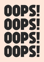 Dit speelse schilderij herhaalt het woord "OOPS!" vier keer in vetgedrukte, zwarte hoofdletters op een charmante lichtroze achtergrond. Een leuke en speelse toevoeging aan elke ruimte!