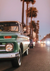 Een schilderij van een groene oldtimer met daarachter palmbomen.