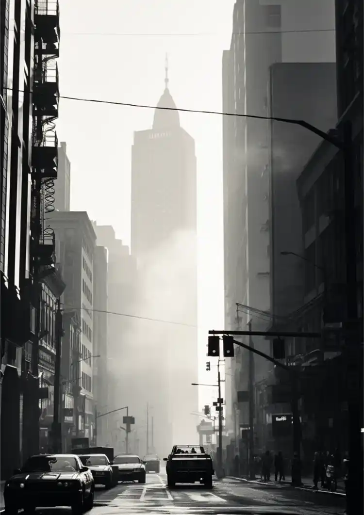 Een zwart-wit foto met mist, uitkijkend op een grote toren.