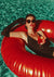 Een vrouw ontspant in een rood opblaasobject op helder water, met sterke contrasten tussen huid, licht en reflectie.