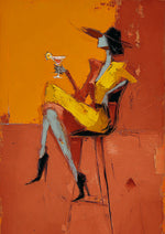 Een gestileerde vrouw leunt ontspannen met een cocktail, gevangen in warme oranje tinten en krachtige, expressieve lijnen.