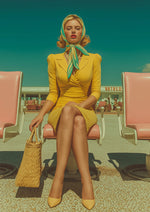 Een vrouw in een gele jurk zit in fel zonlicht, waarbij haar houding en styling een retro, filmische elegantie uitstralen.