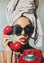 Een vrouw met zonnebril en handdoek om haar hoofd houdt een felrode telefoon vast, een speelse knipoog naar vintage glamour.