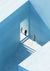 Figuren bewegen door een geometrische, lichtblauwe ruimte waar scherpe lijnen en schaduwen een gevoel van richting en stilte geven.