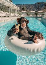 Een chimpansee ontspant in een zwembad met een cocktail, waar humor en luxe samenkomen in een zonnige, surrealistische scène.
