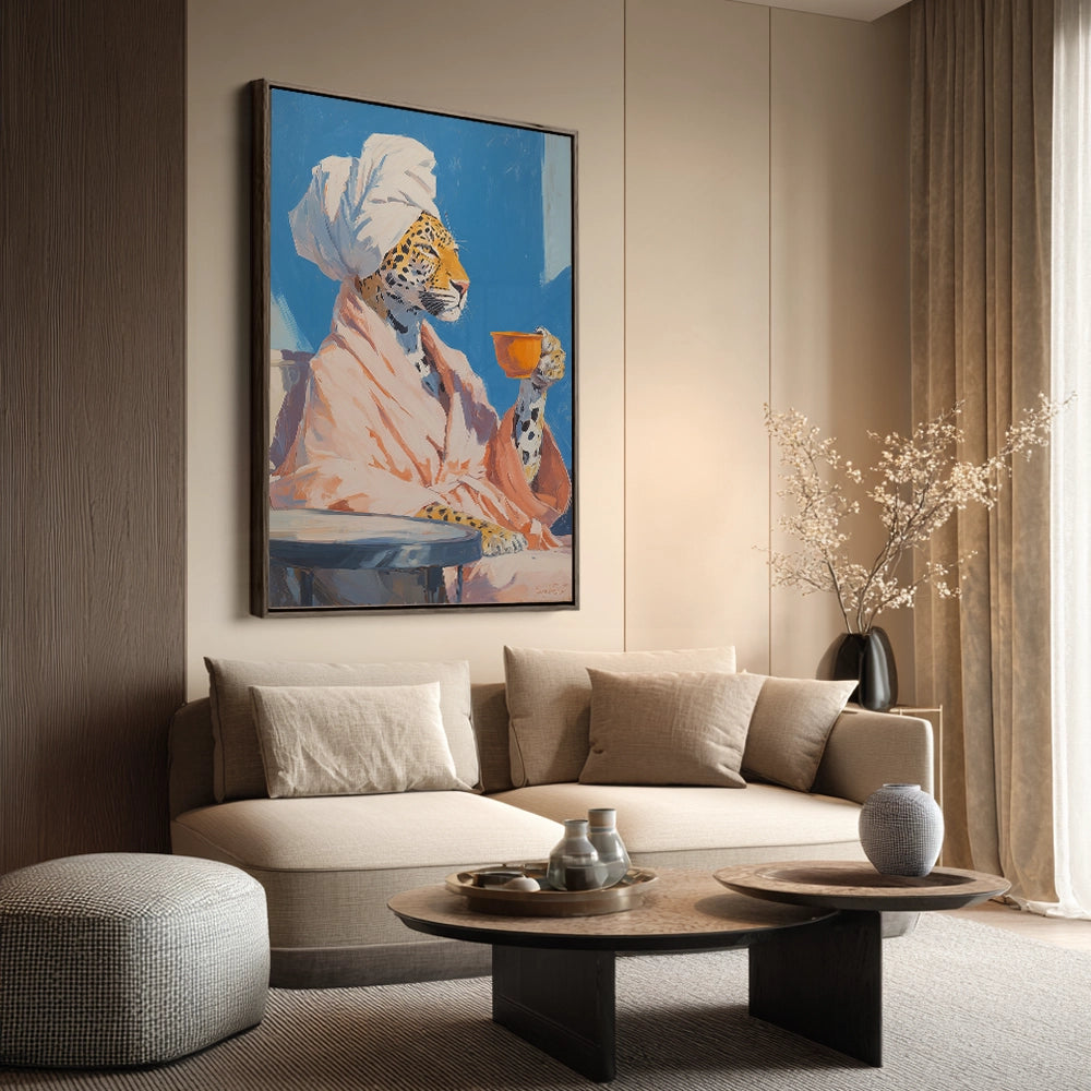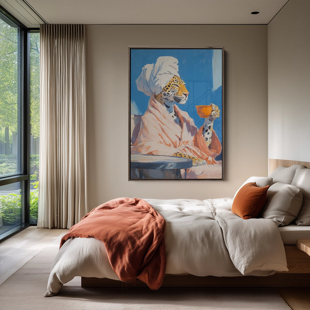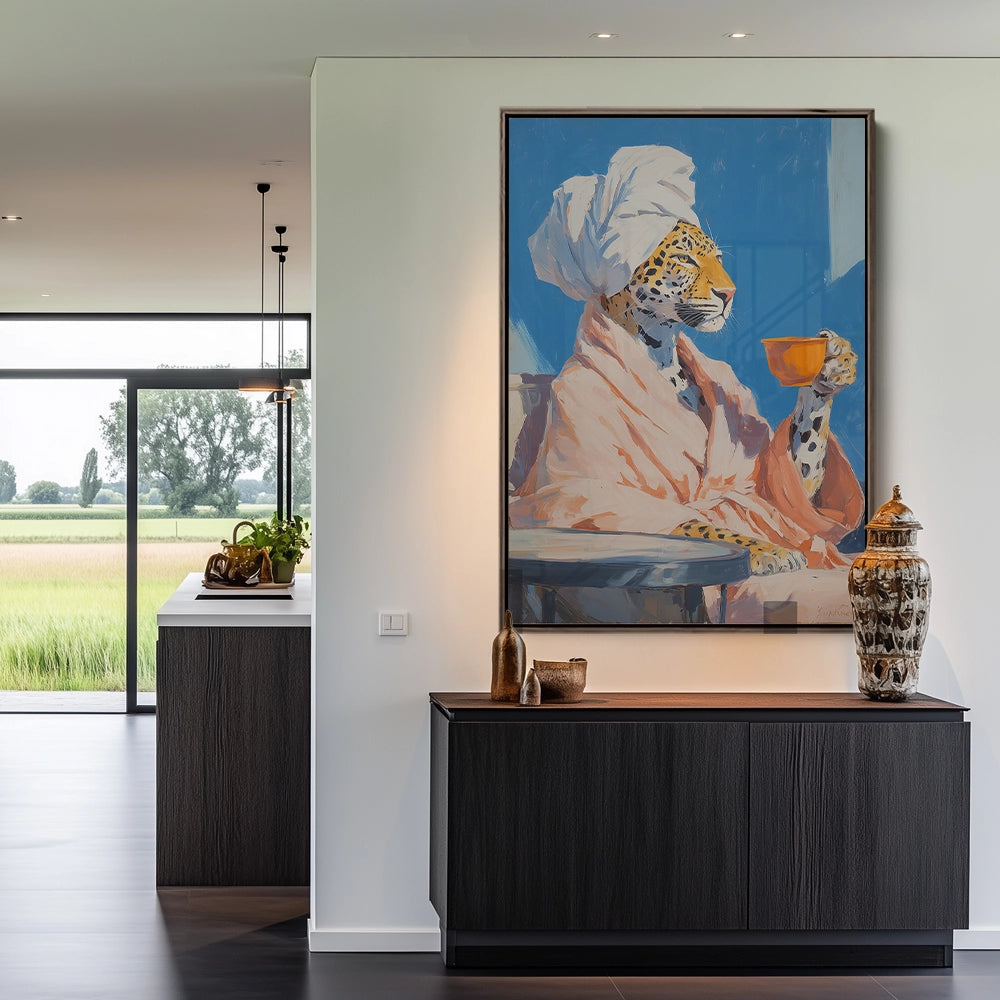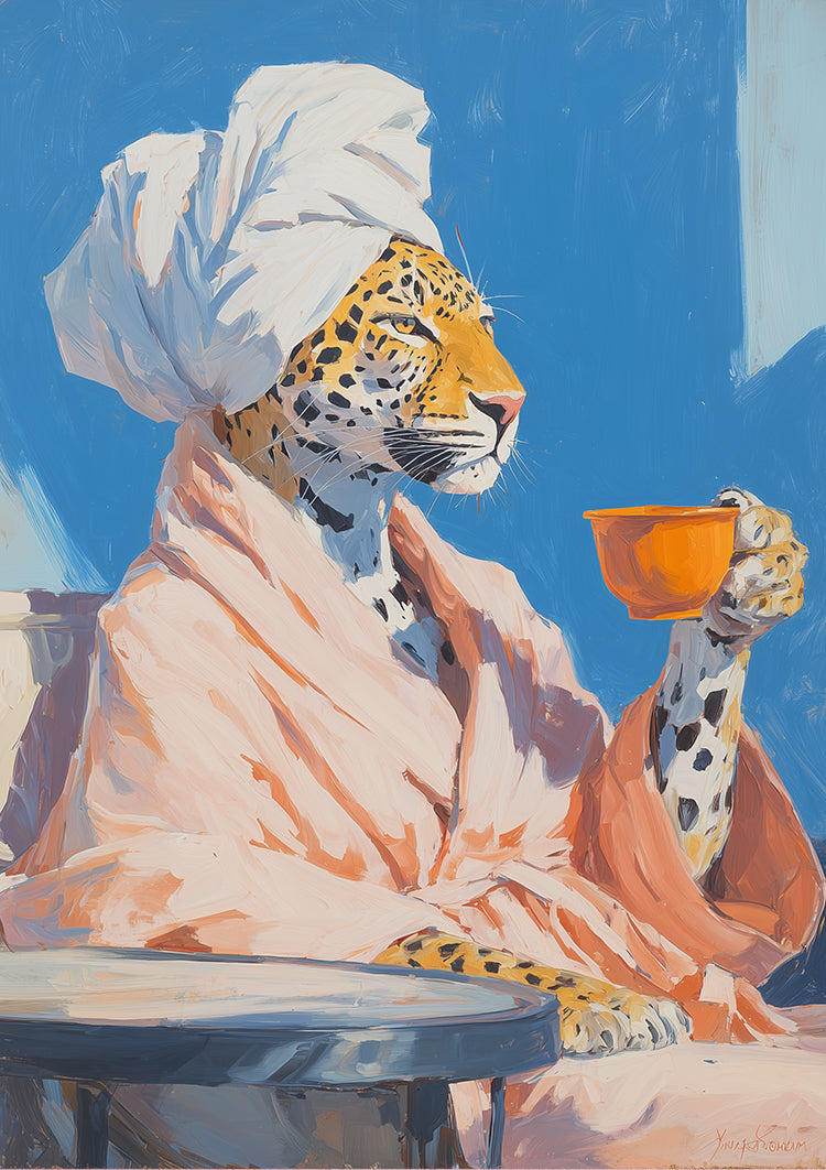 Een luipaard in badjas houdt een kop thee vast, waar huiselijkheid en wilde elegantie op speelse wijze samenkomen.