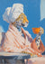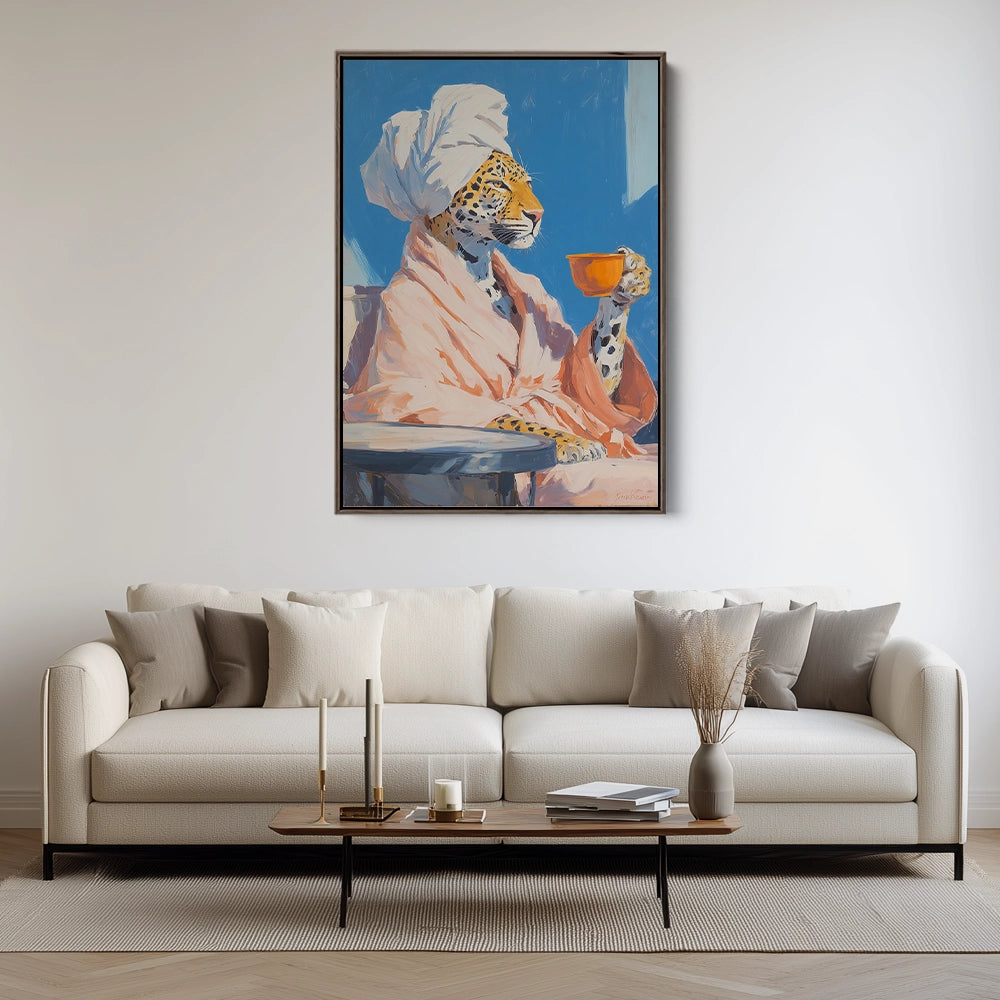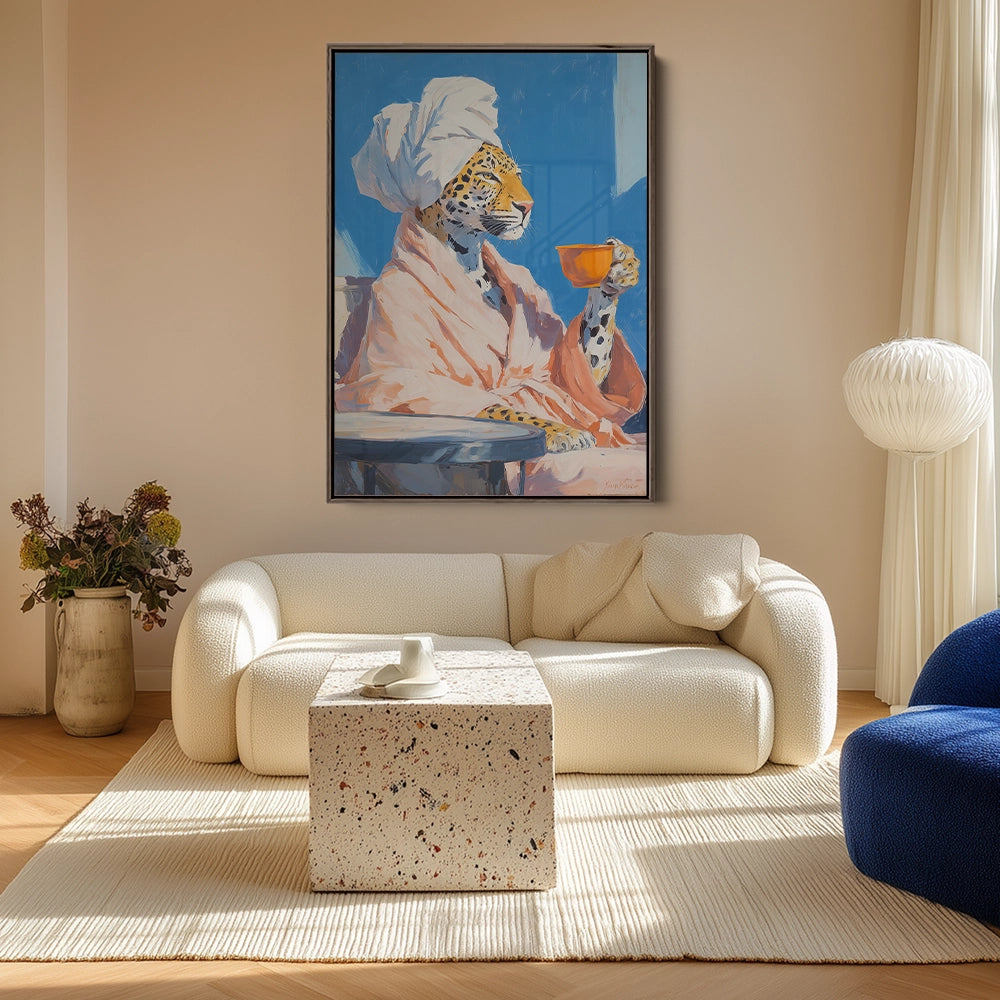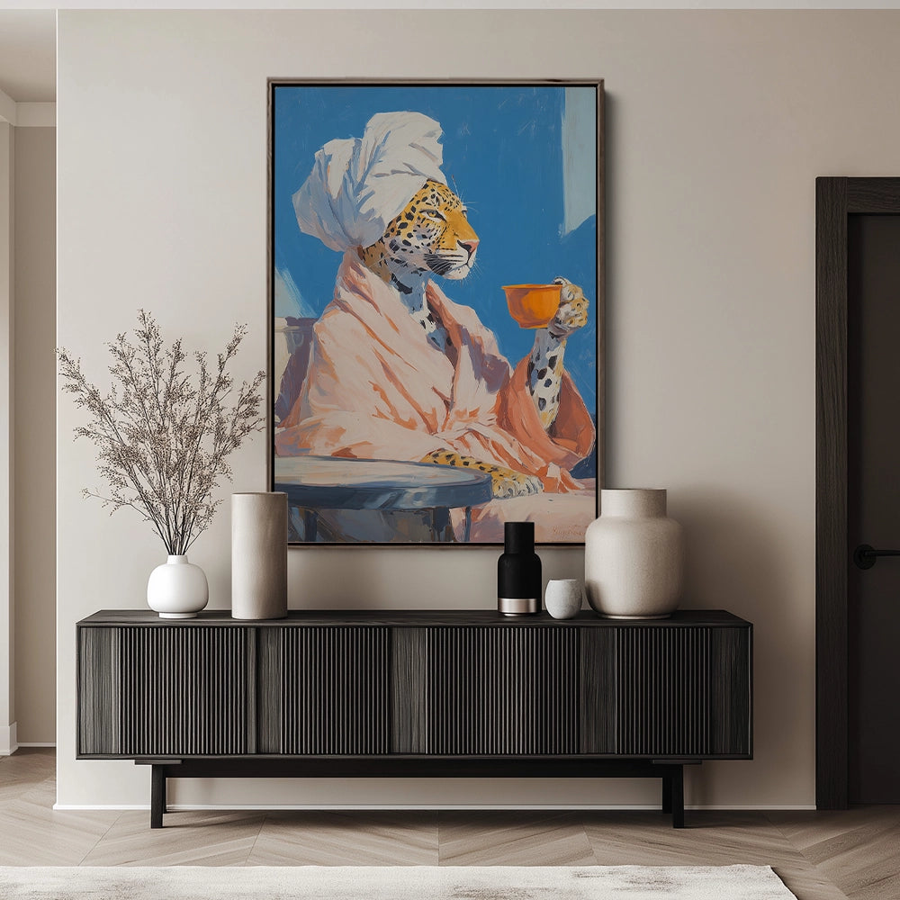 Een luipaard in badjas houdt een kop thee vast, waar huiselijkheid en wilde elegantie op speelse wijze samenkomen.