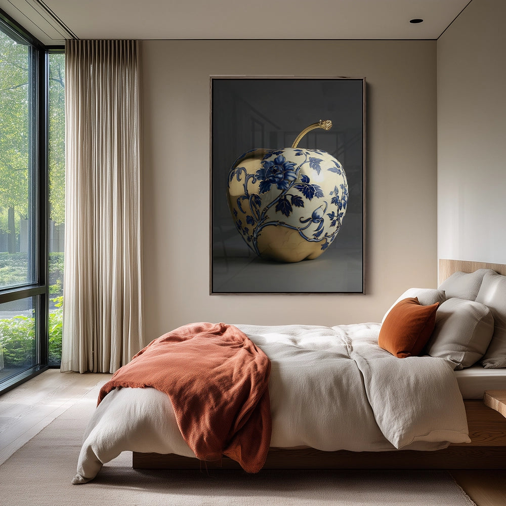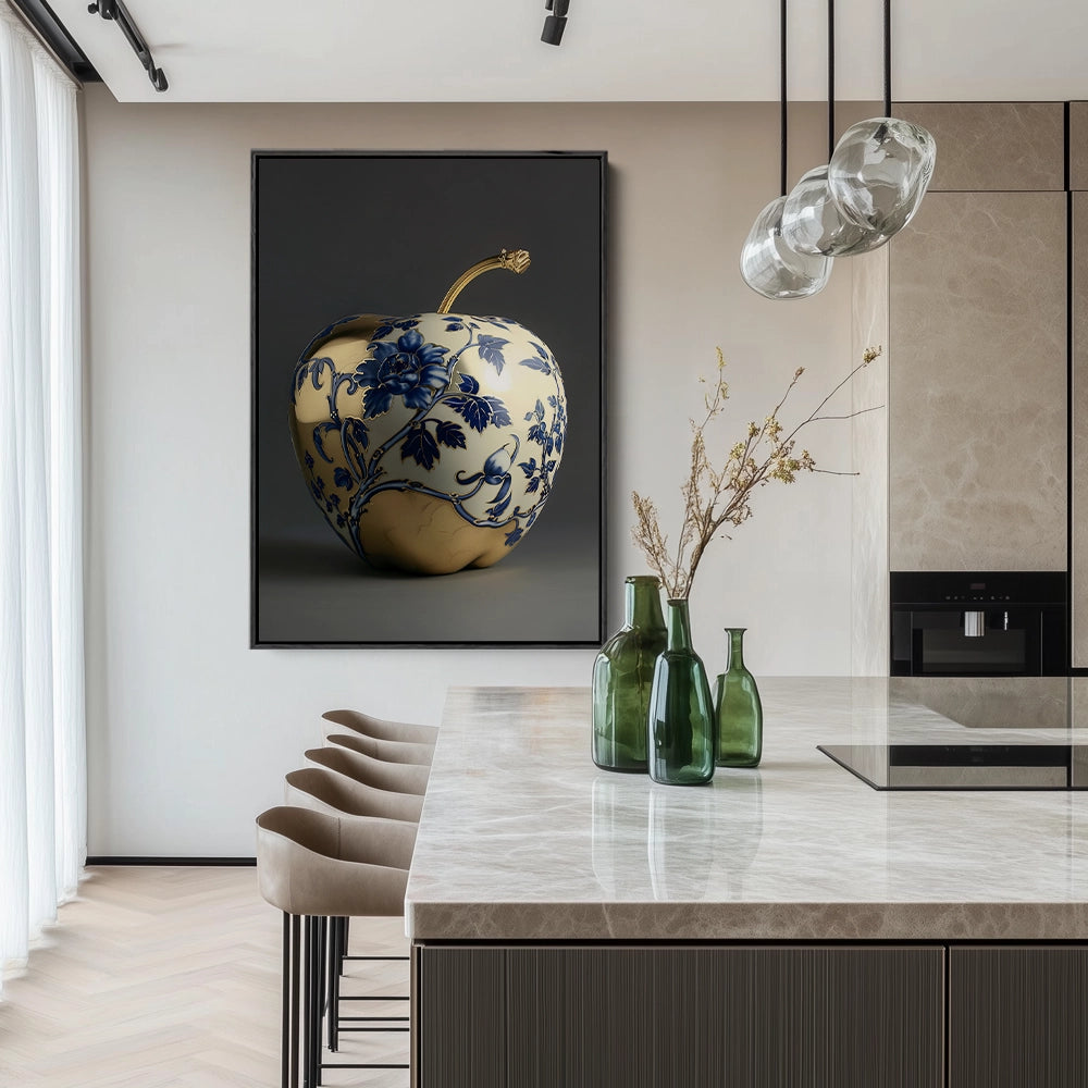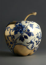 Een glanzende appel met blauw-witte florale patronen, waarin klassieke keramiek en moderne vormgeving samenkomen.