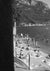 Een zwart-witfoto toont een groep mensen die ontspannen op een strand ligt met bergen op de achtergrond.