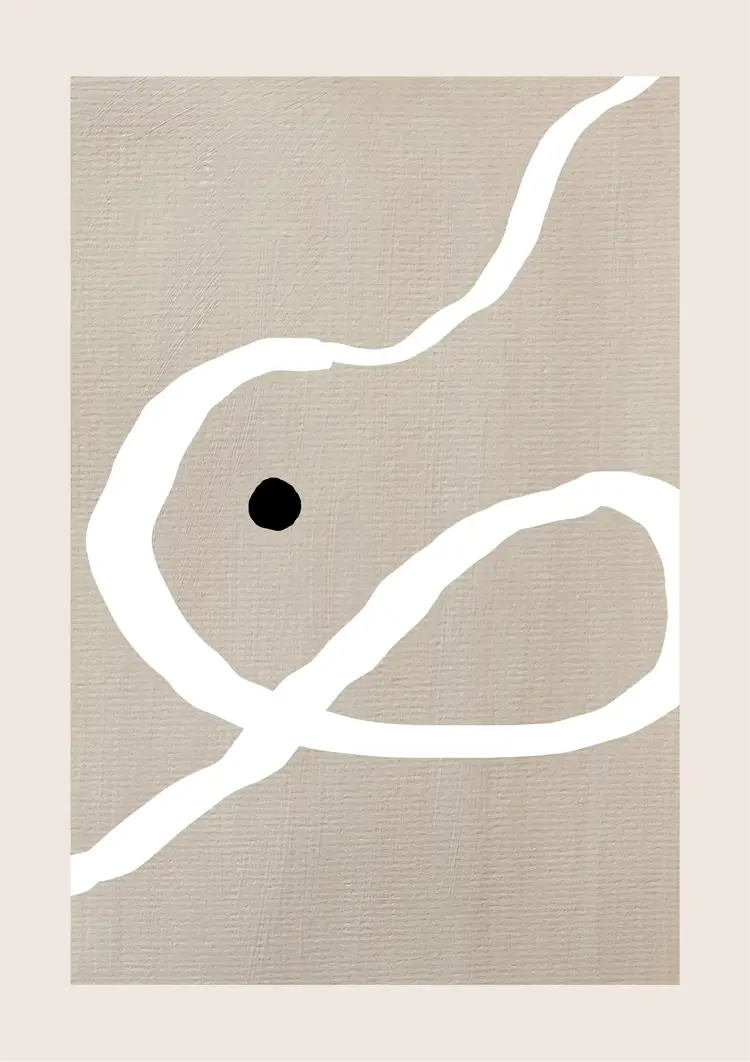 Een prachtig abstract beige schilderij met een witte streep en zwarte stip.