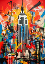 Dit schilderij toont een kleurrijk abstract kunstwerk van het Empire State Building met een levendige,