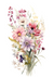 Dit schilderij toont een aquarelillustratie van een boeket met roze, paarse, gele en blauwe bloesems, met groene bladeren en stengels.