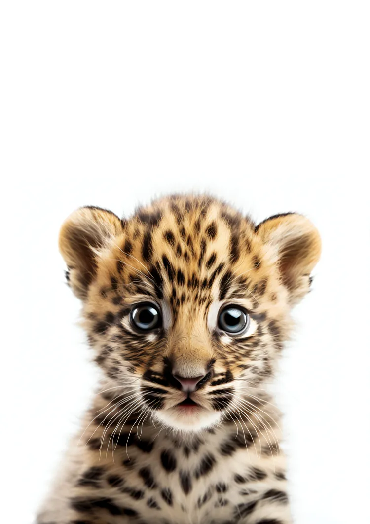 Dit schilderij vangt een close-up van een schattige babyluipaard tegen een heldere achtergrond. Met grote, waakzame ogen, een gevlekte vacht en zijn mond een tikkeltje open, straalt het speelsheid uit.