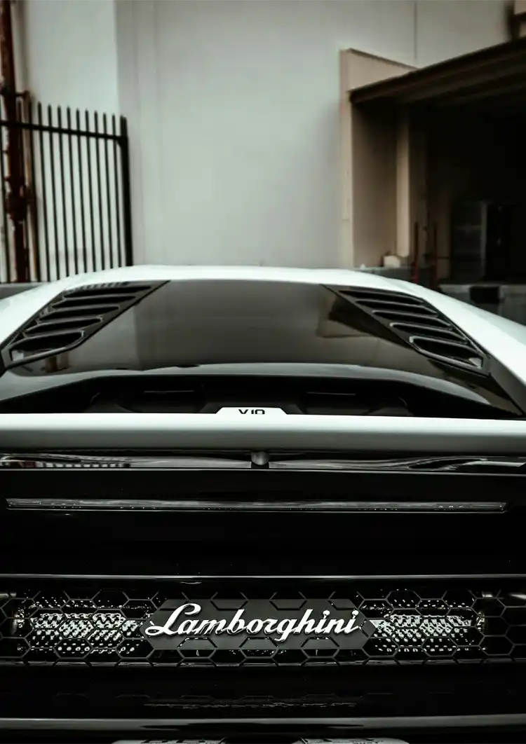 Een close-up van de achterkant van een Lamborghini Huracan, met de nadruk op de V10-motorkap en het merklogo op de grille. De auto staat geparkeerd in een smal steegje met een hek op de achtergrond.