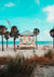 Dit schilderij toont een badmeestertoren op een zandstrand met palmbomen op de achtergrond.