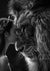 Dit schilderij toont een zwart-witafbeelding van een vrouw die zachtjes het voorhoofd aanraakt van een grote leeuw, waarbij hun gesloten ogen een sereen, intiem moment van verbondenheid tonen.