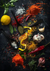 Dit schilderij toont een donker tafelblad bezaaid met specerijen, kruiden en ingrediënten waaronder citroen, knoflook, chilipepers en laurierblaadjes.