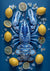 Schilderij van een blauwe kreeft liggend op een donkerblauw oppervlak, omringd door hele citroenen, schijfjes citroen en witte bloemblaadjes. De kreeft staat centraal met uitgestrekte klauwen.