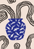 Dit schilderij toont een blauwe vaas met witte abstracte patronen op een beige achtergrond, omringd door zwarte golvende lijnen.
