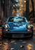 Dit schilderij toont een blauwe vintage Porsche 911 met ronde koplampen, geparkeerd op een met bladeren bezaaide weg omringd door hoge bomen. Het tafereel speelt zich af in de vroege avond, met straatverlichting op de achtergrond. De koplampen van de auto zijn aan en verlichten het pad.