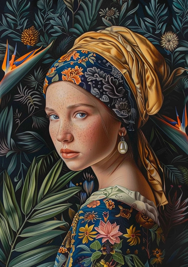 Dit schilderij toont een jonge vrouw met een lichte huid en rood haar, gekleed in een gebloemde jurk en een gele hoofddoek met een pareloorring tegen een donkere groene achtergrond.