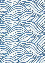Een patroon schilderij met blauwe golven op een witte achtergrond, waardoor een ritmisch, oceanisch ontwerp ontstaat.