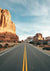 Dit schilderij toont een rechte, lege weg die zich in de verte uitstrekt, geflankeerd door hoge, roodachtige rotsformaties onder een heldere, blauwe lucht.Kleine stukjes sneeuw zijn zichtbaar tussen de rotsen.