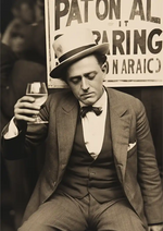 Een zwart-wit schilderij van een man met een drankje. Met daarachter tekst op de muur.