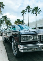 Dit schilderij toont een glanzend zwarte Chevy Caprice met grote chromen wielen geparkeerd onder wuivende palmbomen tegen een heldere hemel.
