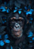 Dit schilderij toont een chimpansee omringd door blauwe vlinders en donkere bladeren, kijkend naar de camera met levendig blauwe bloemen en bladeren tegen een contrasterende achtergrond.