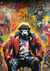 Dit schilderij toont een levendig graffitikunstwerk met een chimpansee in een pak en de achtergrond is een kleurrijk.